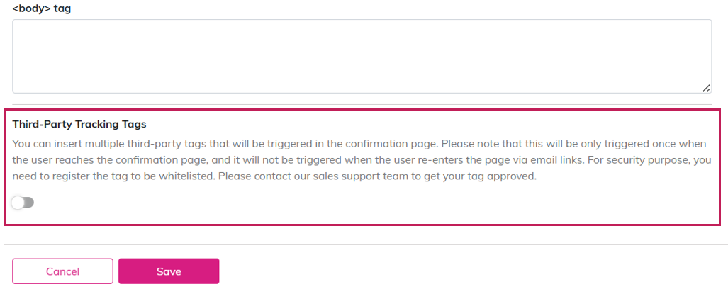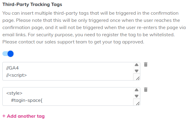 Third-party tracking tags allow conversion tags (for ads, analytics, etc.) to be embedded on the reservation completion page.