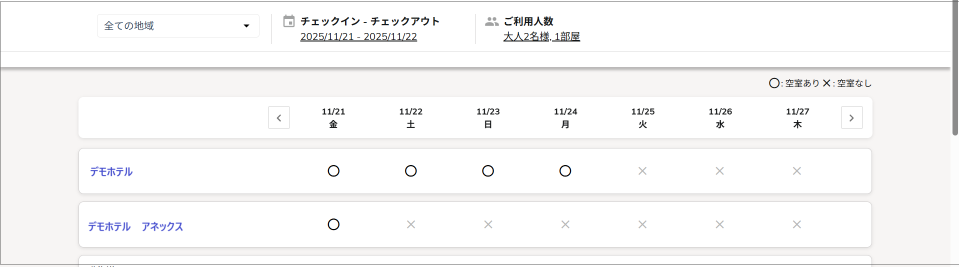 チェーンホテルのブランドTOPページに設置する検索バーでエリア検索が可能になります。