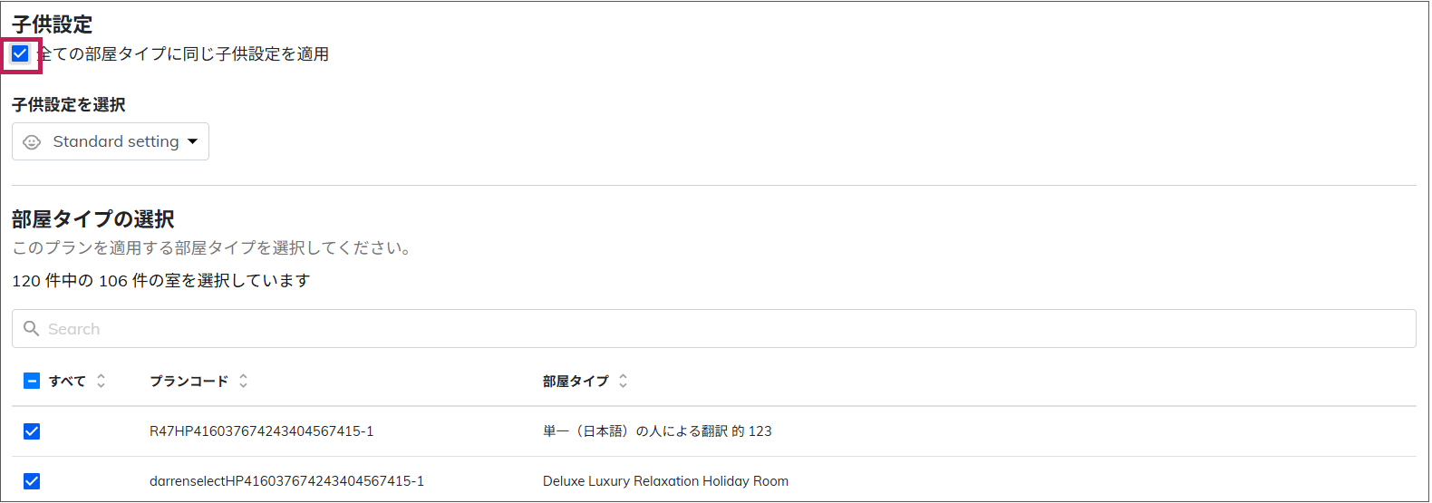 プラン詳細の「子供設定」でチェックが入っていなければ、プランでも「子供設定」の選択ができるし、部屋タイプでも選択ができるようになる。