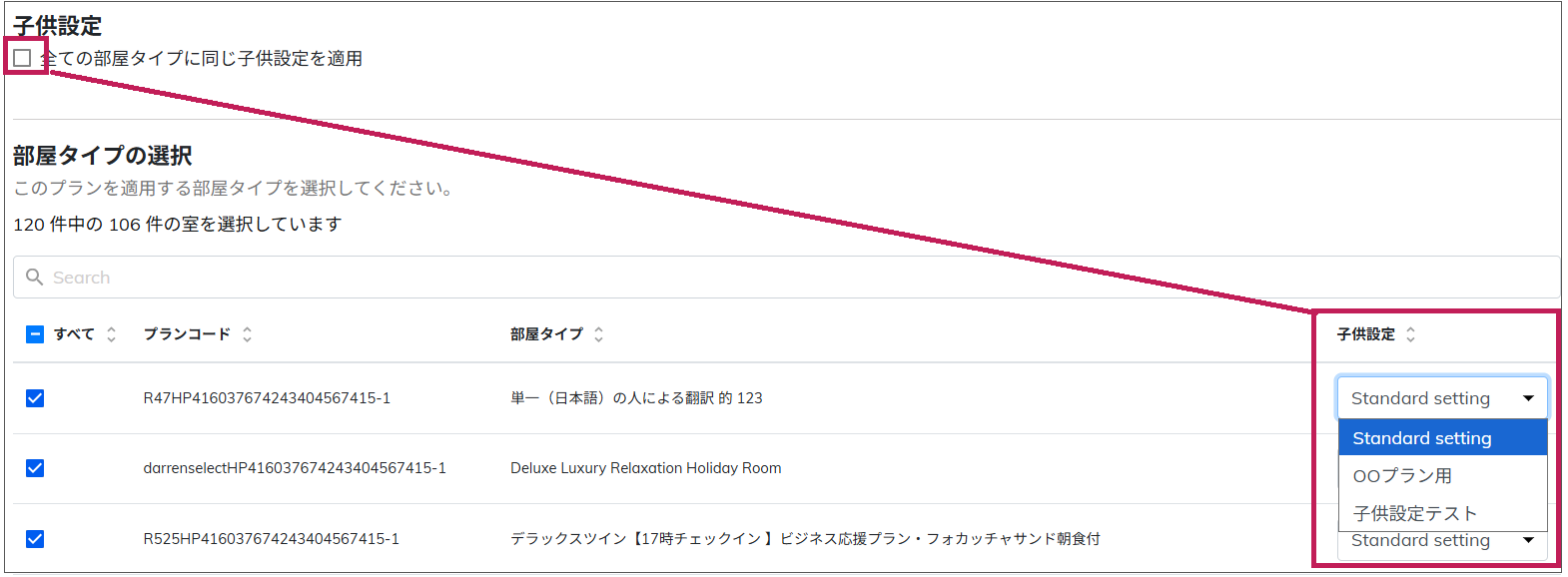 部屋・プランごとに子供設定を変える