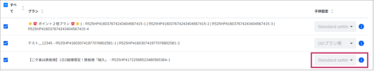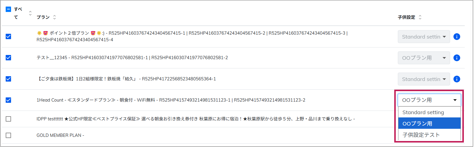 プランごとに子供設定を変える場合