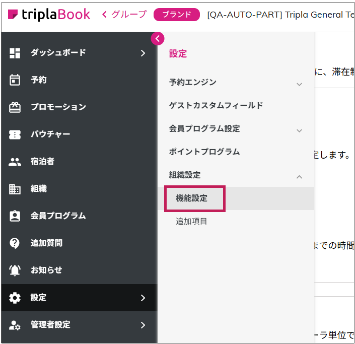 ブランド管理画面>予約エンジン設定>組織設定>機能設定