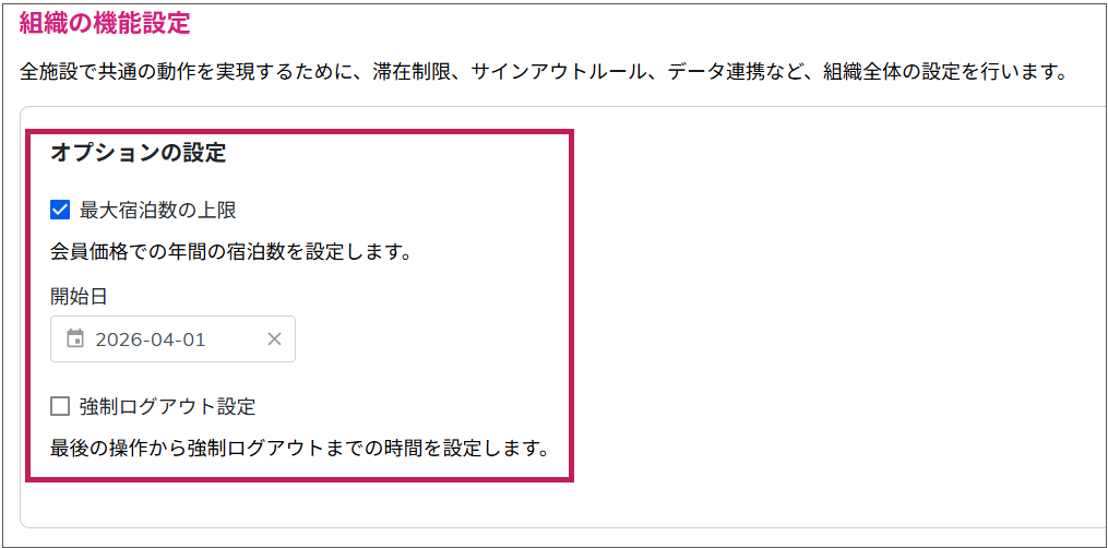 組織(法人)の最大宿泊数や強制ログアウト、組織情報の連携設定が可能です。