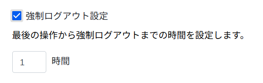 強制ログアウト設定 | 最後の操作から設定時間が経過すると自動的にログアウトさせる設定ができます。 強制ログアウト時間 強制ログアウトが発生するまでの時間を1時間単位で指定します。 |