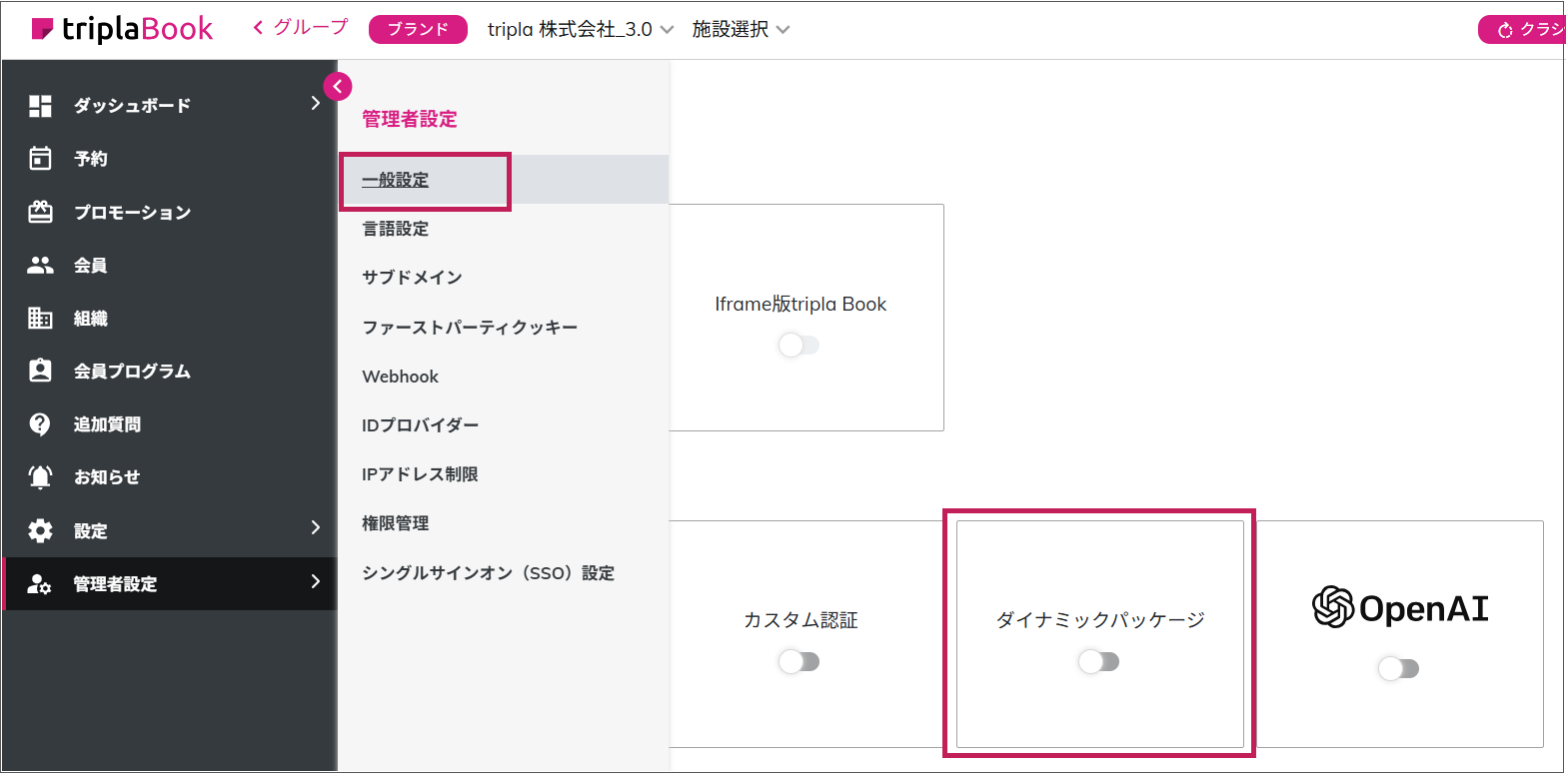 確認箇所:ブランド管理画面の管理者設定>「ダイナミックパッケージ」のON