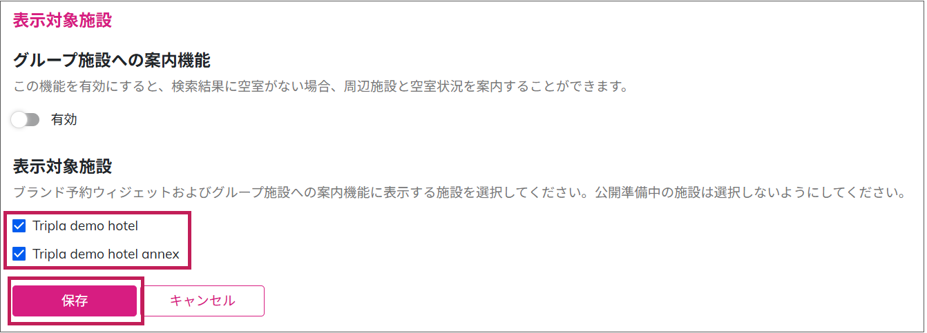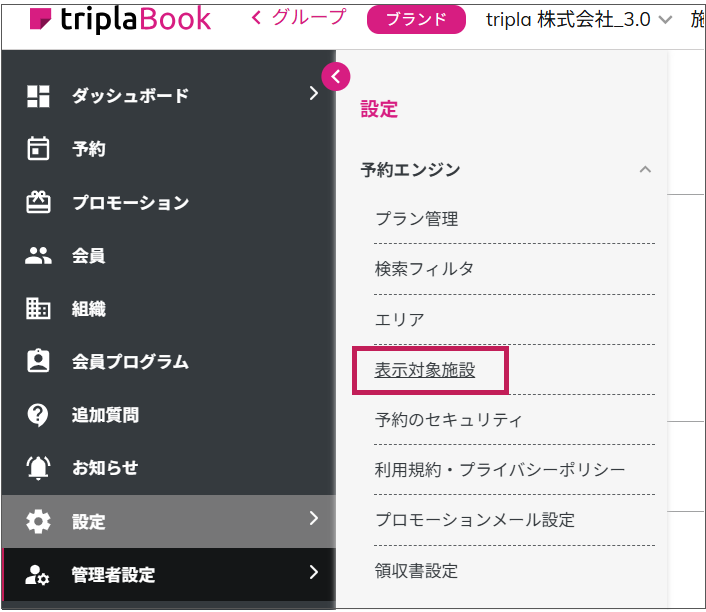 確認箇所:ブランド管理画面の予約エンジン設定>「施設の表示設定」>「表示対象施設」の施設にチェック