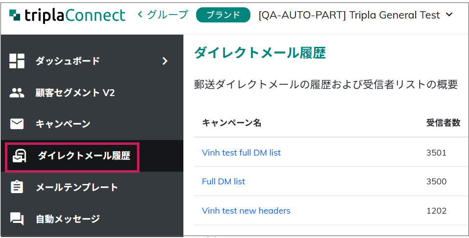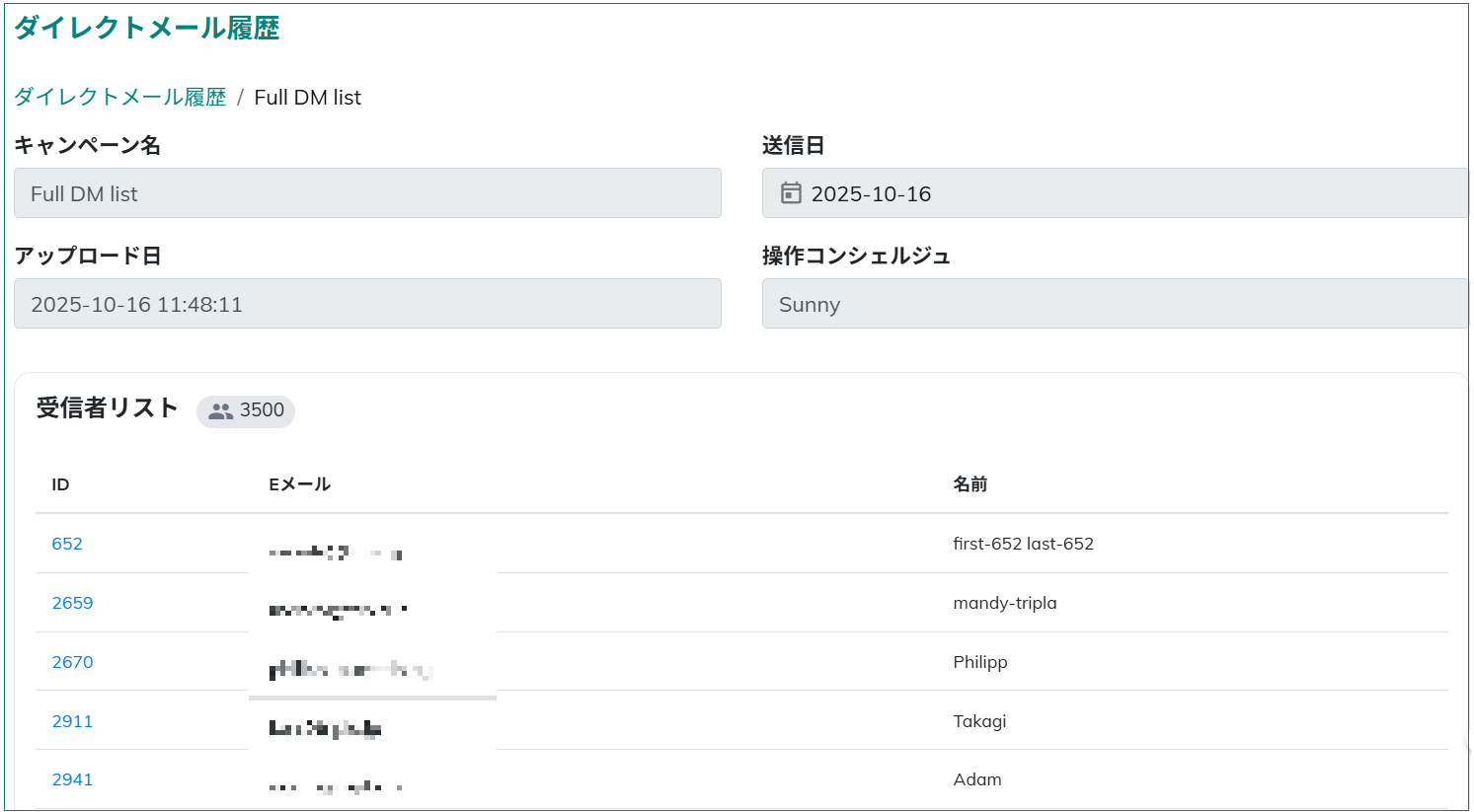 ダイレクトメール履歴を開き、一覧からメールキャンペーンをクリックすると、