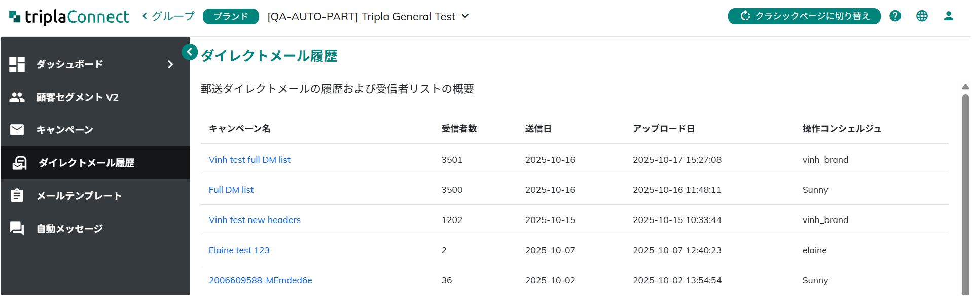 郵送で送信したダイレクトメールの履歴を一覧で確認できます。