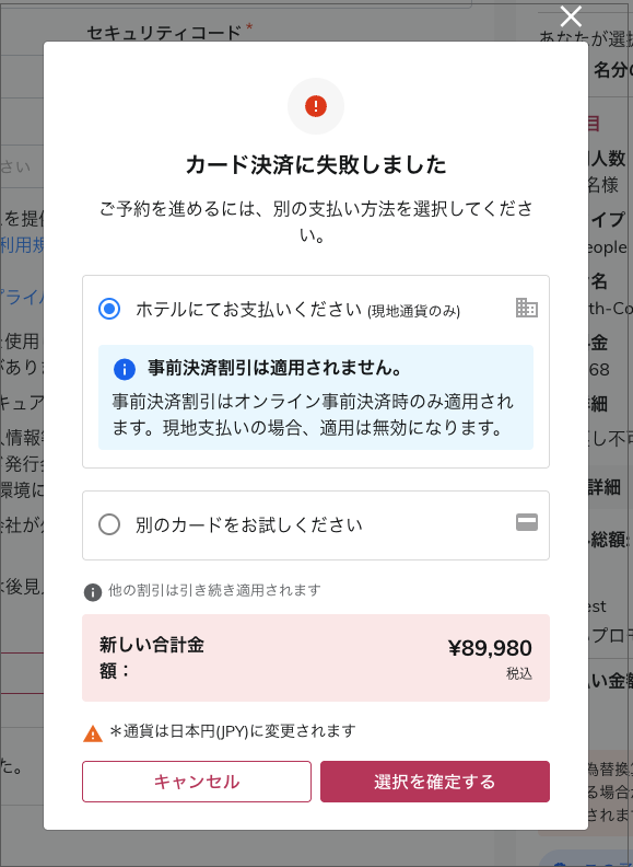 - 現地決済に切り替え