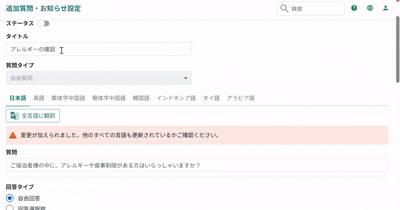 追加質問のON/OFFの切り替えができます。ONにするとお客様側画面に表示されます。