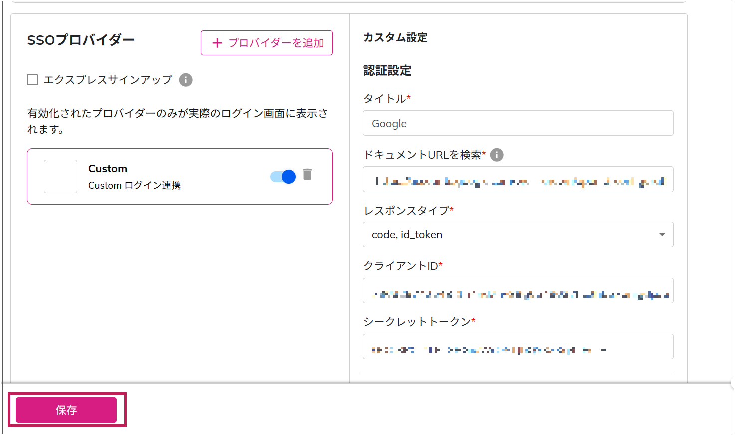 シングルサインオン設定をONにし、[SSOを追加する]から[カスタム]を選択します。